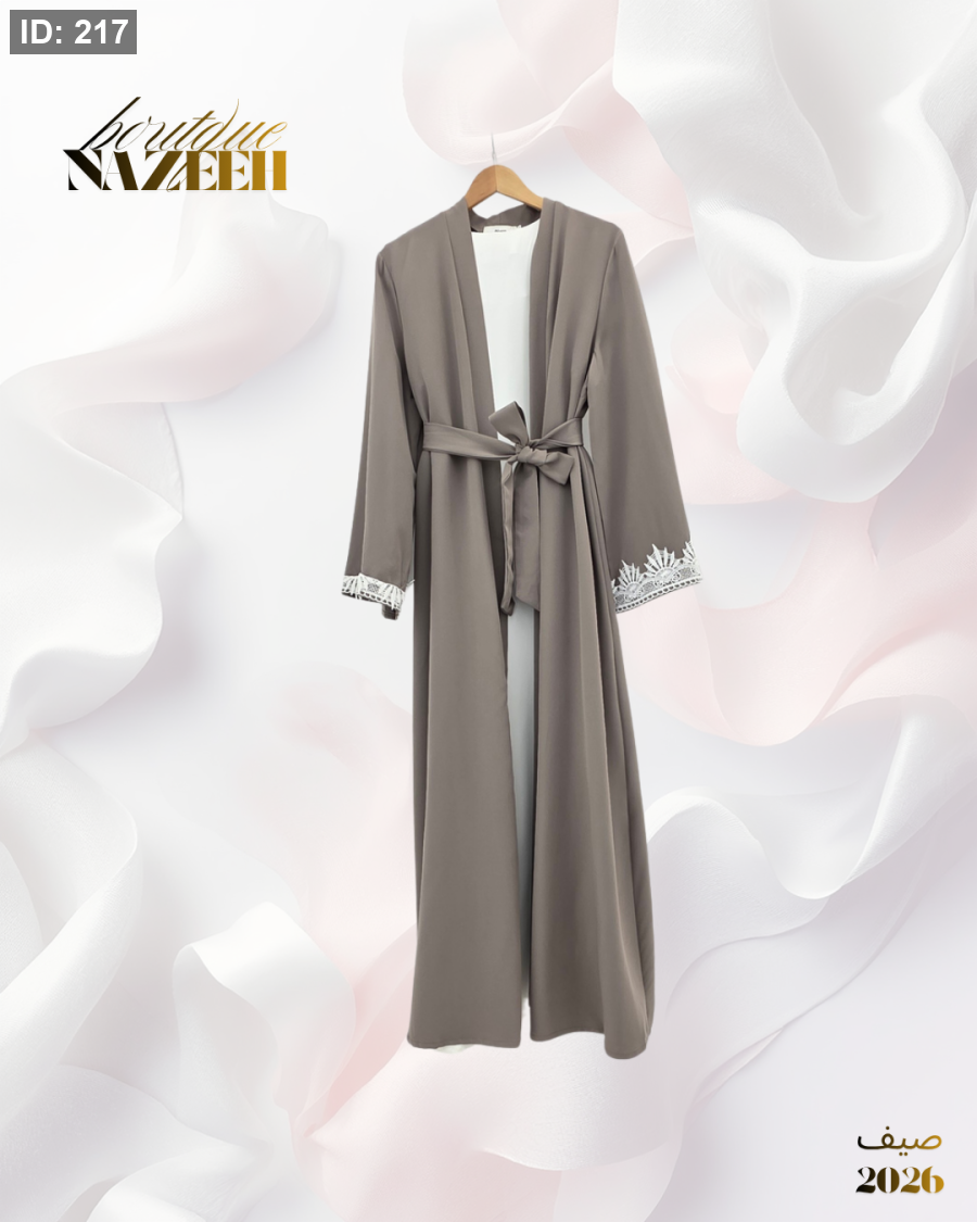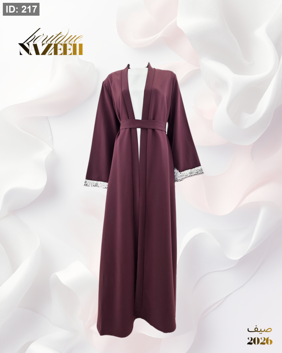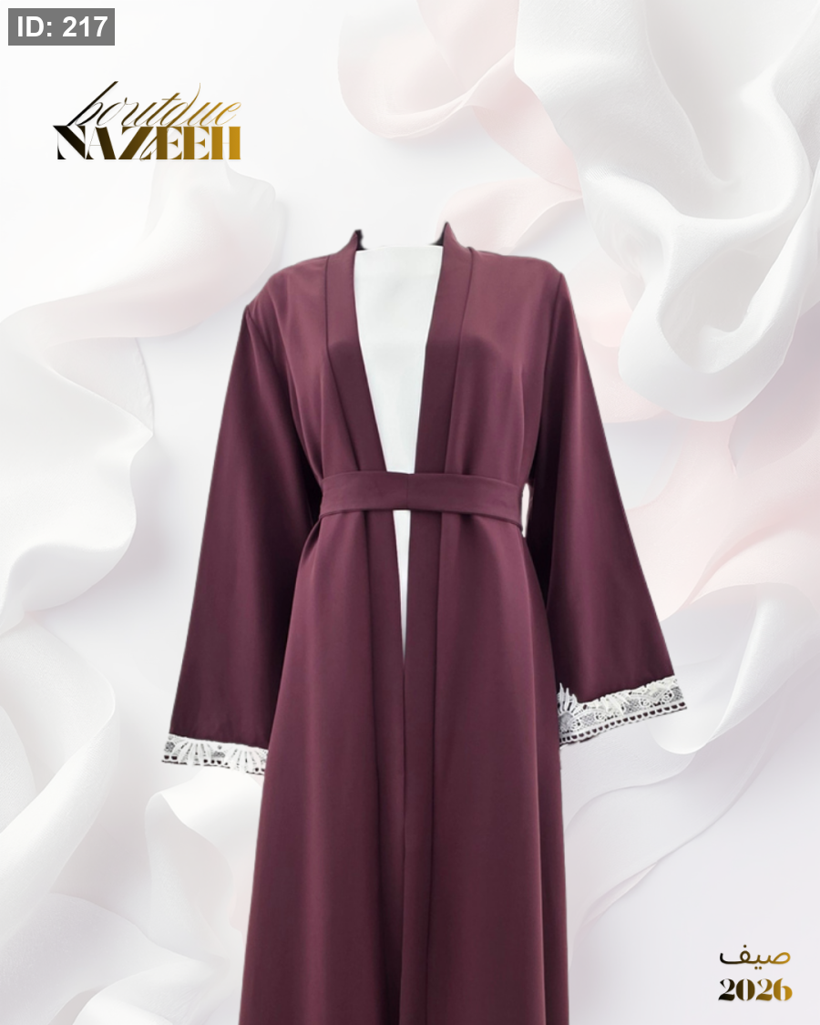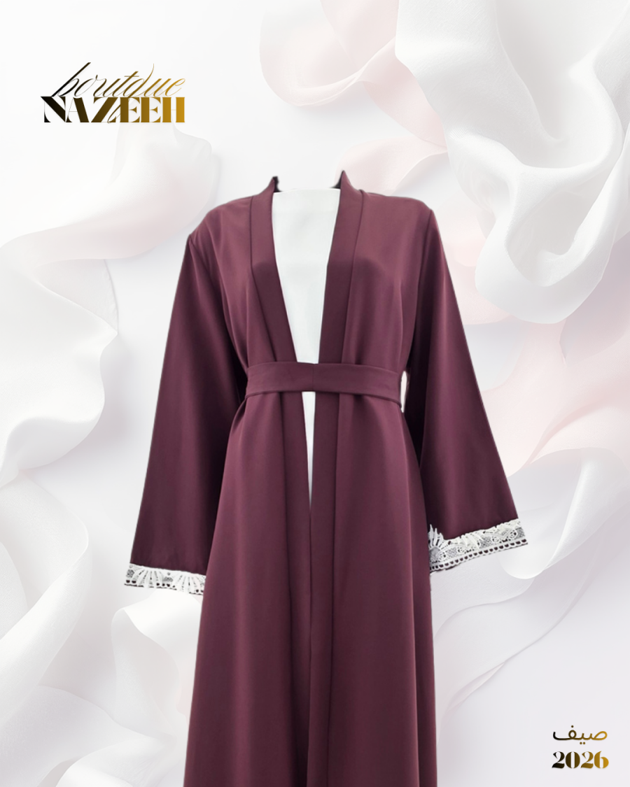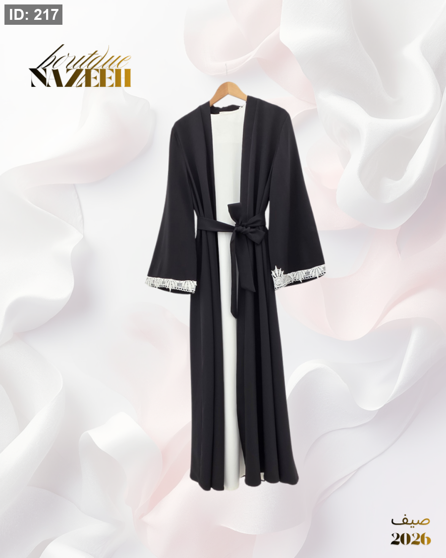 عباية قطعتين بقصة واسعة مريحة تتكون من قطعة داخلية باللون الابيض وعباية خارجية بحركة من الدانتيل عند الاكمام