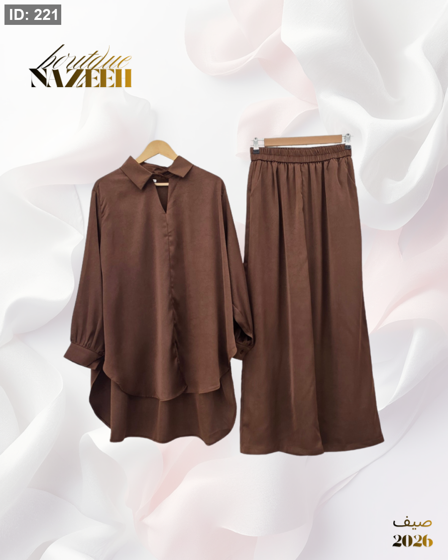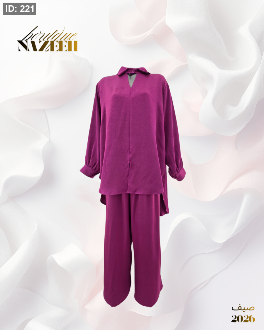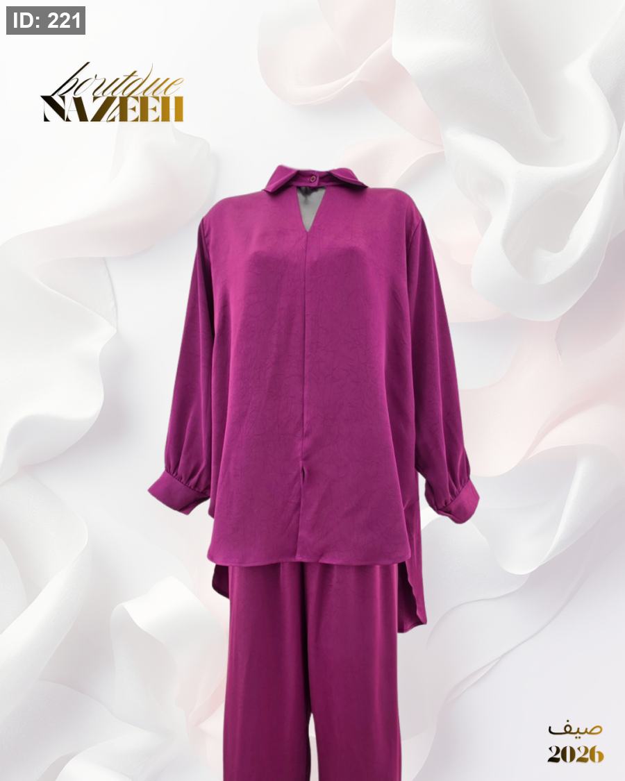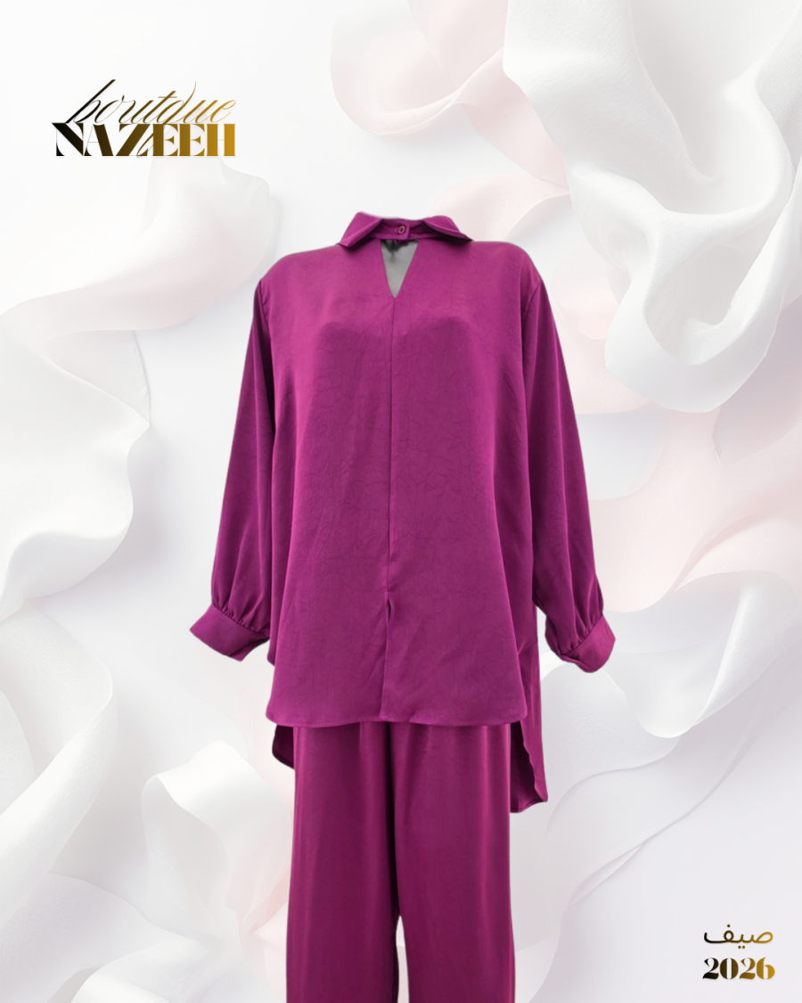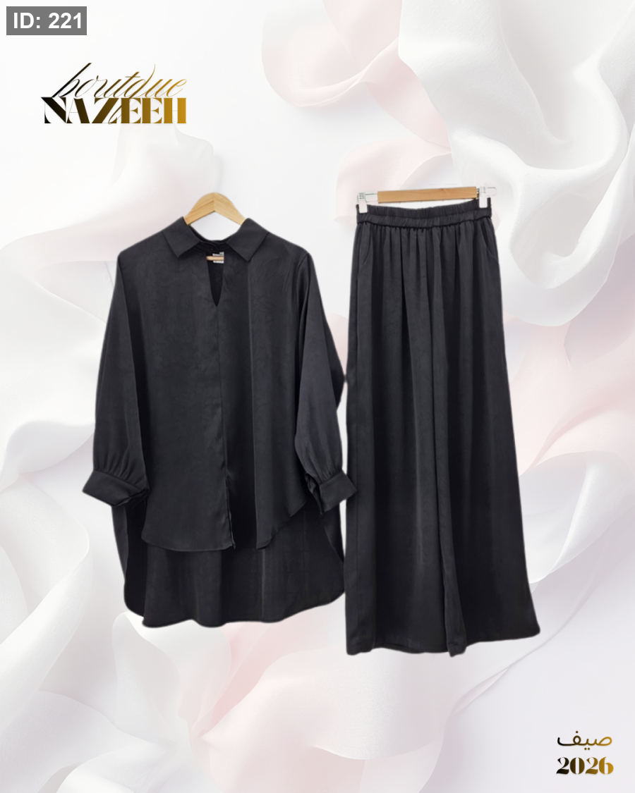 طقم ستان صيفي ينكون من بلوزة مفتوحة عند القبة بقصة قصيرة من الامام وطويلة من الخلف مع بنطلون