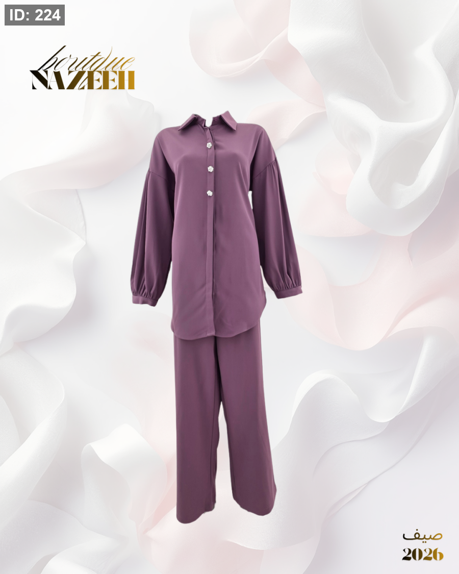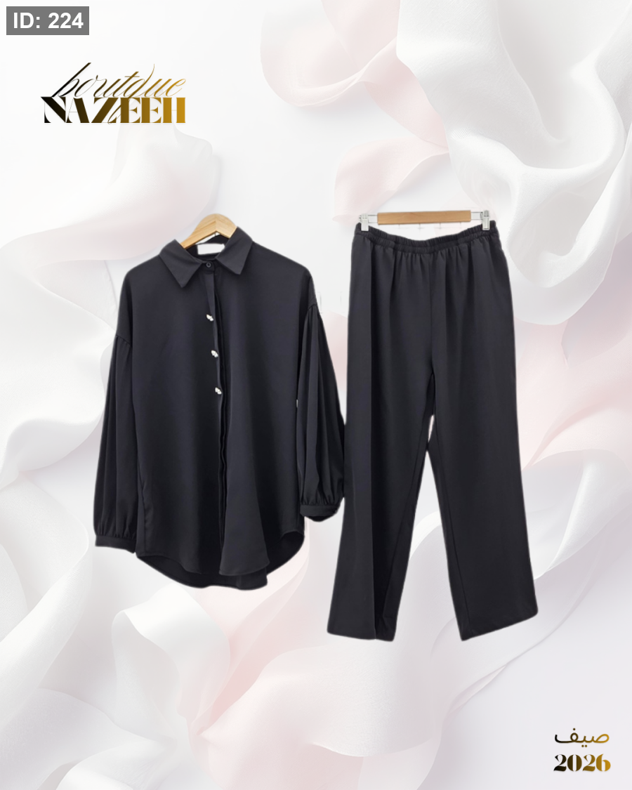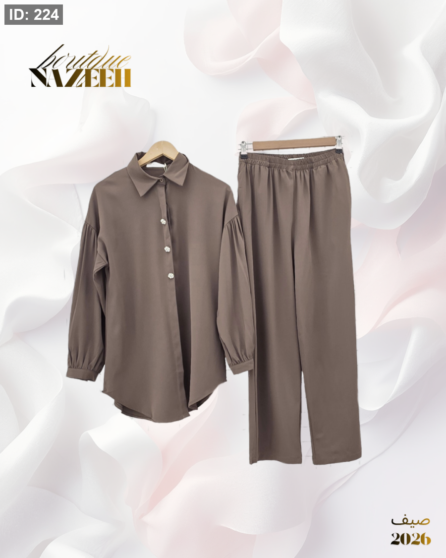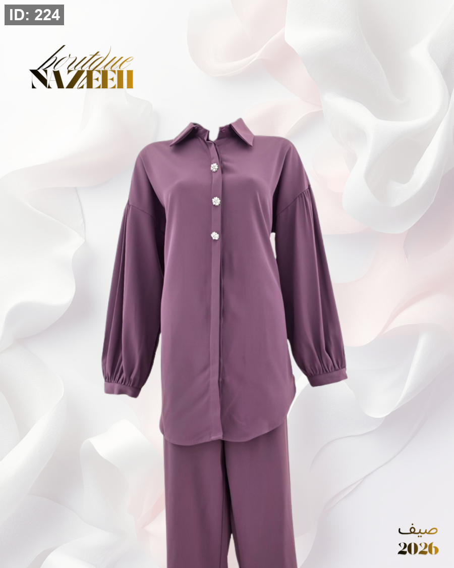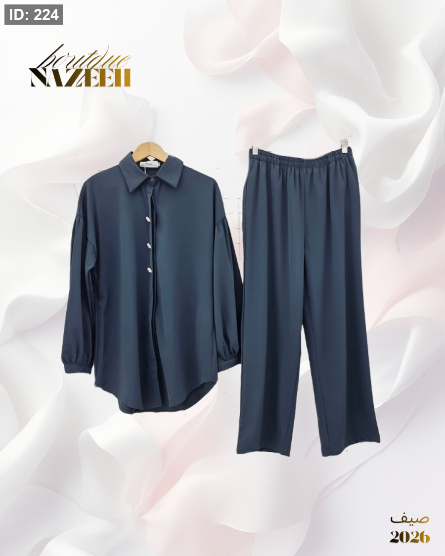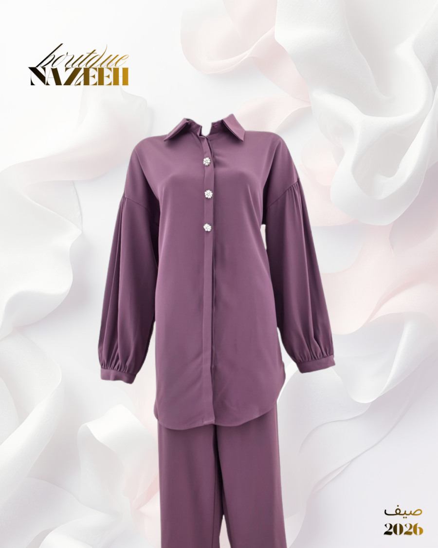 طقم صيفي انيق بخامة باردة يتكون من قميص بطول متوسط بازرا رمن الخرز مع بنطلون واسع